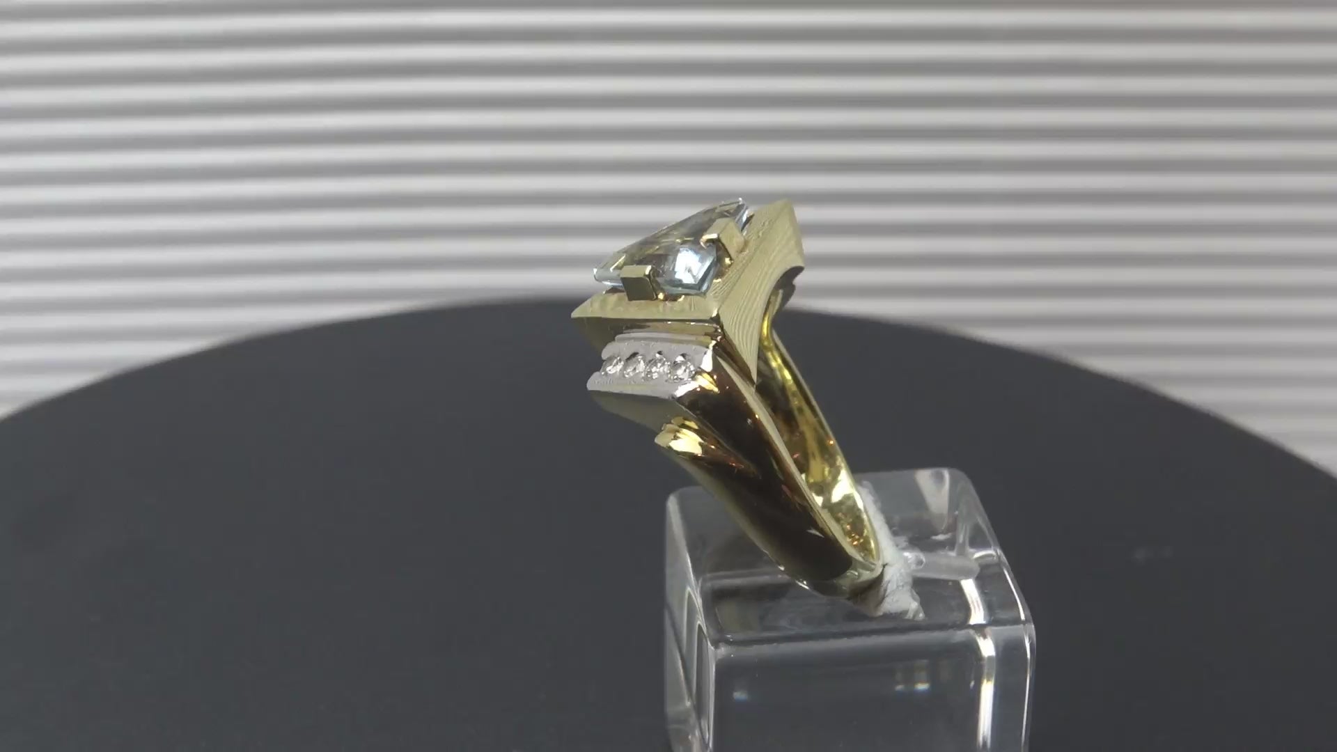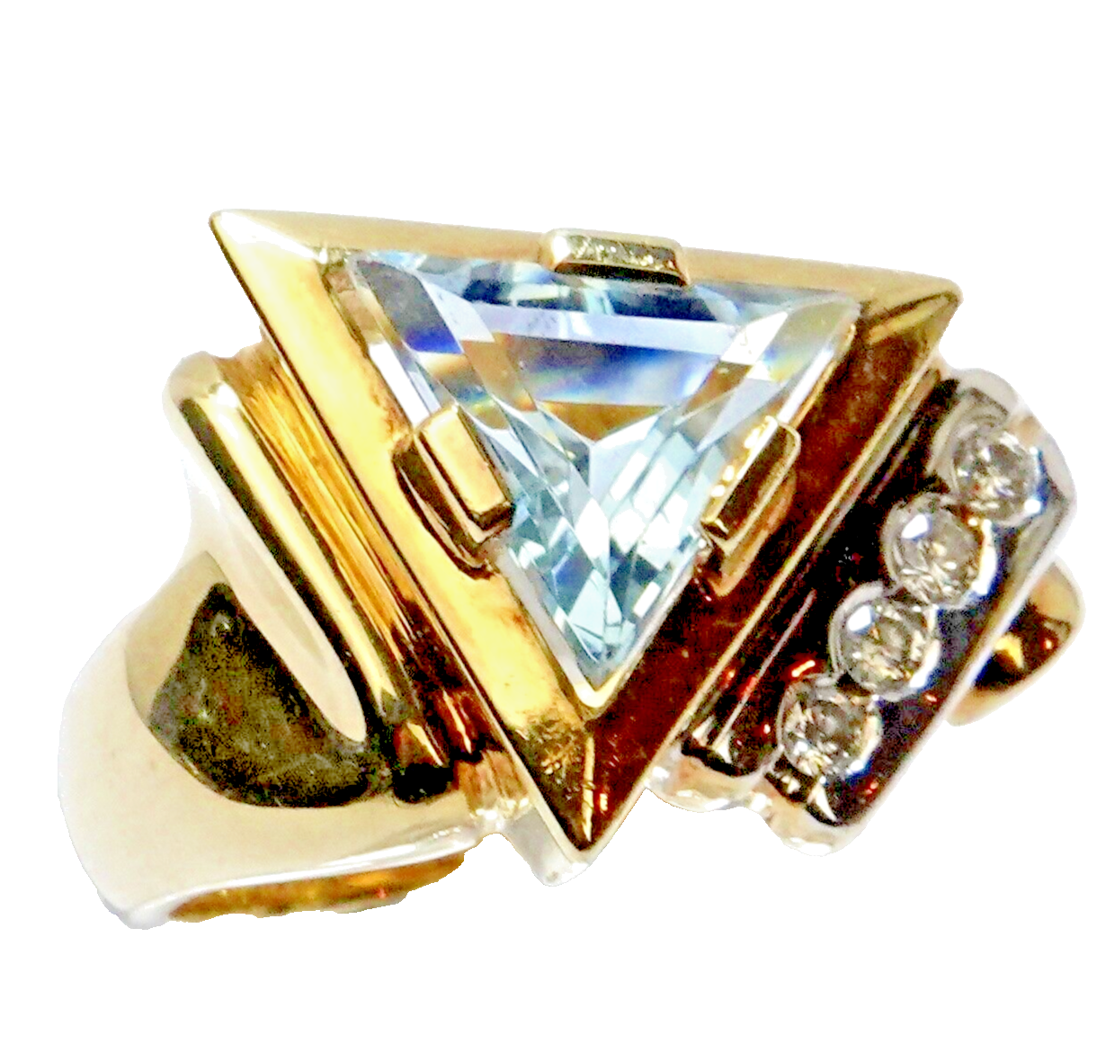 In der Dreiecks-Zarge ist ein 2,5 ct. Aquamarin im Formschliff gefasst.