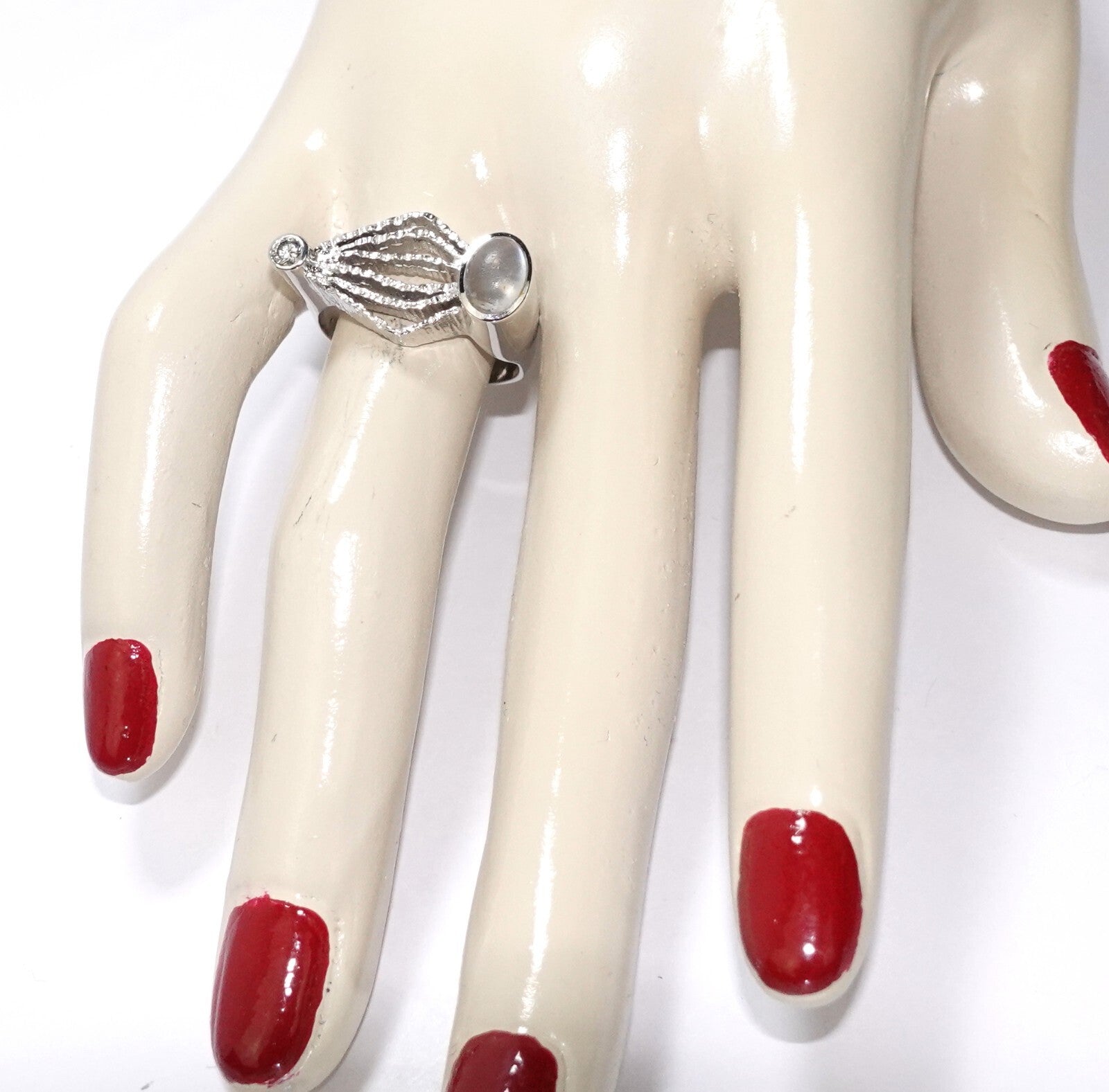 Die beiden Enden der Ringschiene sind mit einem Mondstein-Cabochon bzw. einem Diamanten besetzt.
