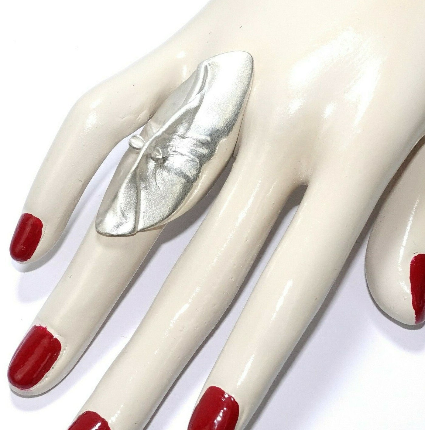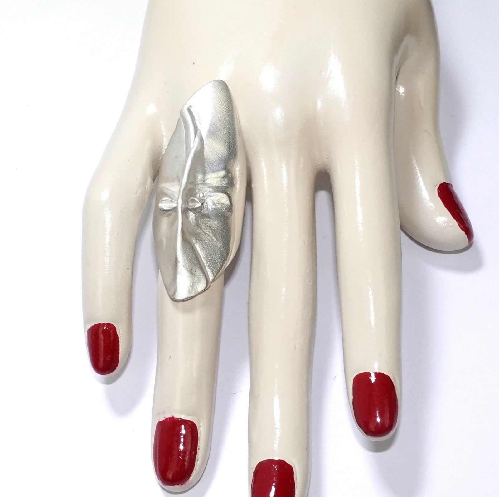Lapponia-Ring in Silber 925, 16 Gramm schwer. Der gestreckte, blatt- bzw. maskenartige Ringkopf ist von unten ausgehöhlt und schmiegt sich angenehm um den Finger. Hervorragender Tragekomfort zwischen Gr. 56 und 58.