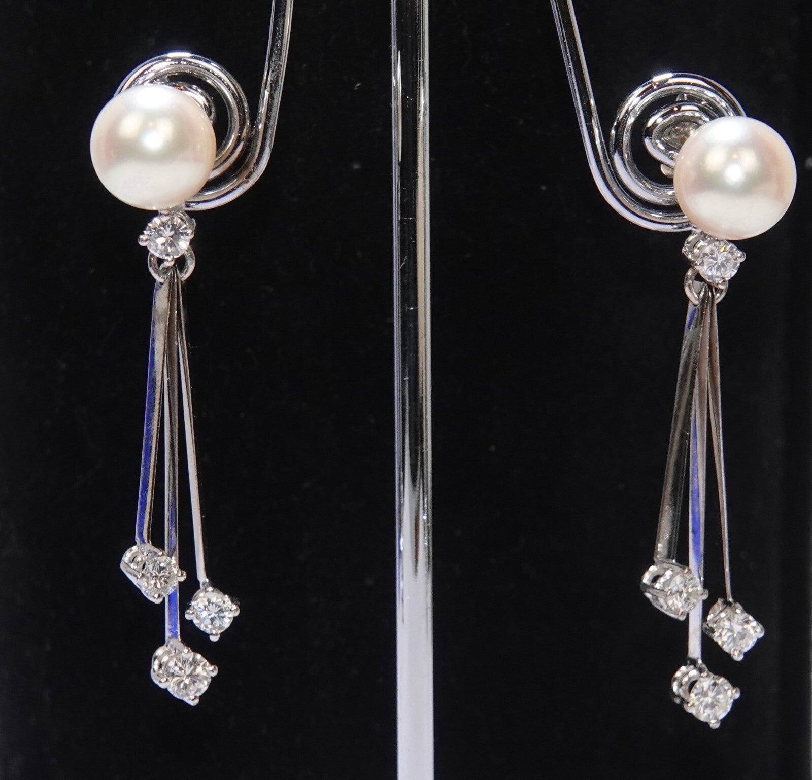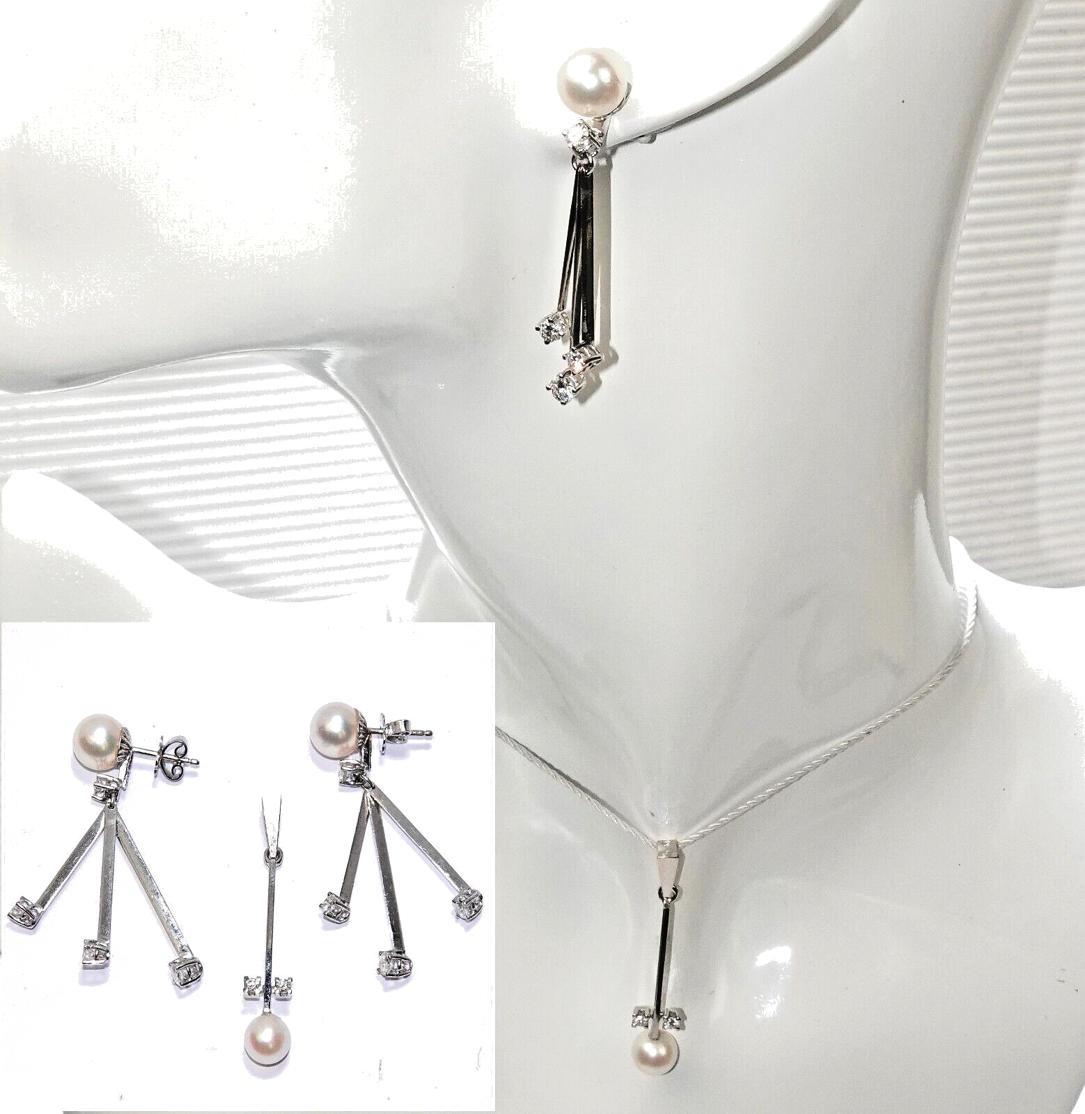 Exklusives Schmuckset in 750/18K Weißgold, bestehend aus 1 Paar Ohrringen und 1 Anhänger. Oben zieren eine Perle und ein Dimant die Durchführung am Ohrläppchen. Darunter sind an einem Goldring je Ohrring 3 unterschiedlich lange, zierliche Weißgoldbänder aufgehängt, die in Diamanten auslaufen.