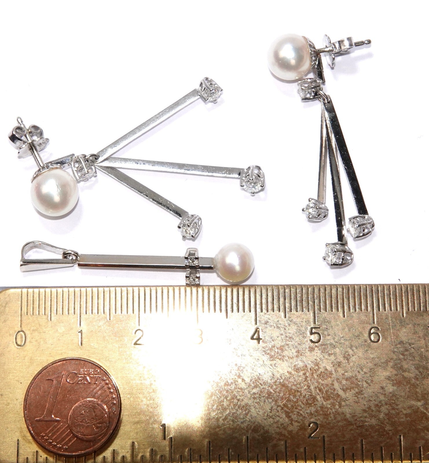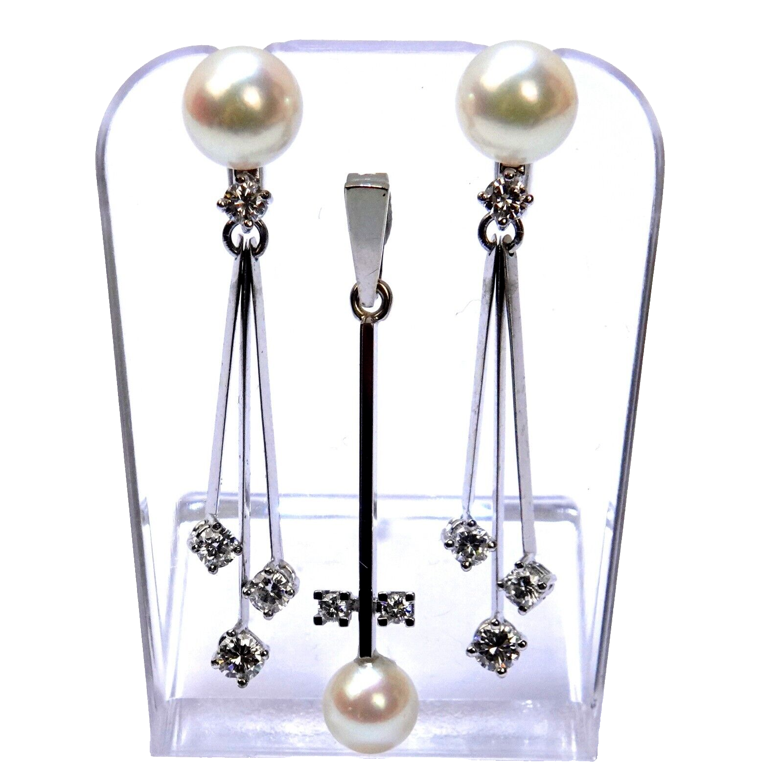 Bei dem Anhänger bildet die Perle den unteren Abschluss, oberhalb akzentuiert durch 2 Diamanten. Die insgesamt 10 Diamanten haben 0,86 Karat und sind von sehr guter Farbe und Reinheit. Bildschönes, zierliches Schmuckset mit exzellenten Steinen - Handarbeit in bestem Zustand.