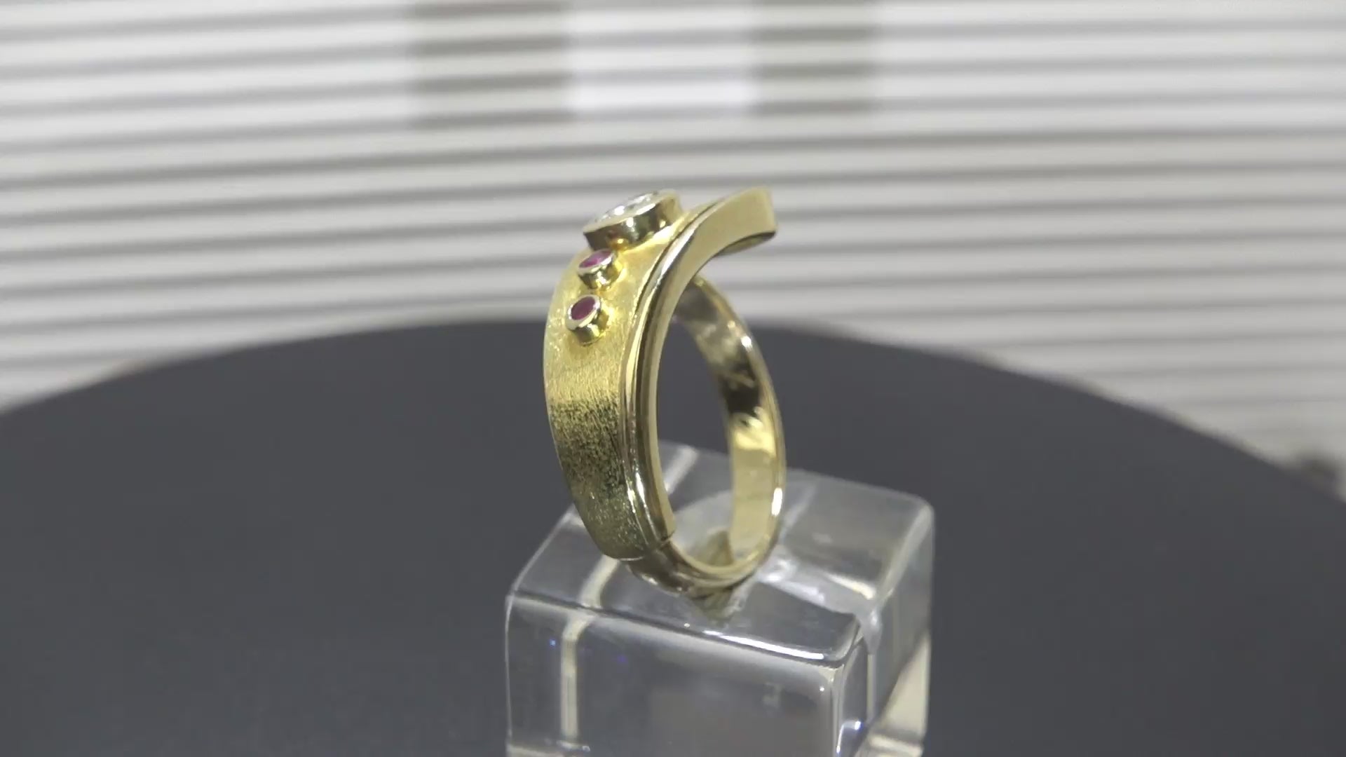 Auf die Ringschiene ist einseitig ein mattiertes / satiniertes Goldband aufgesetzt,
