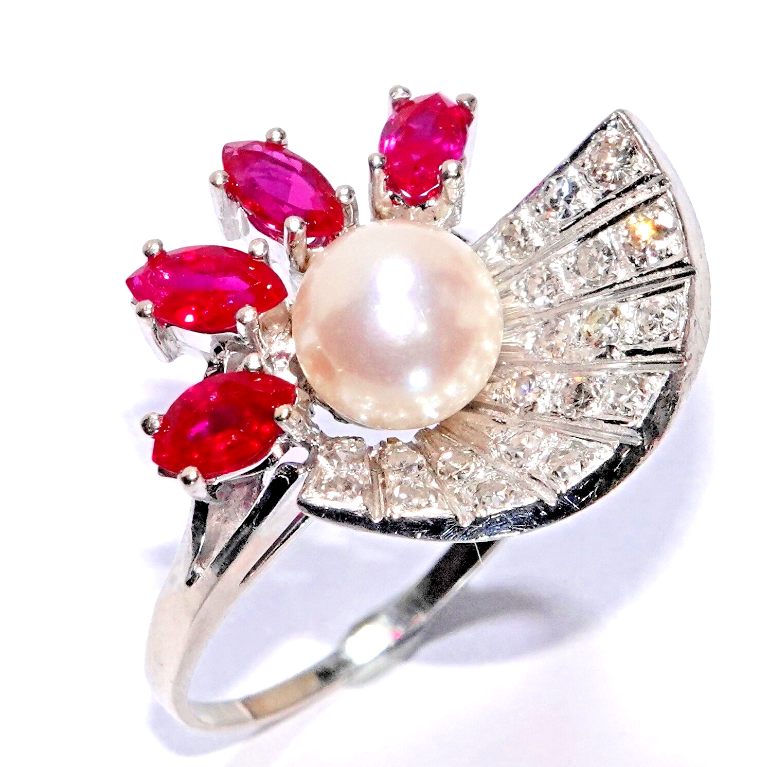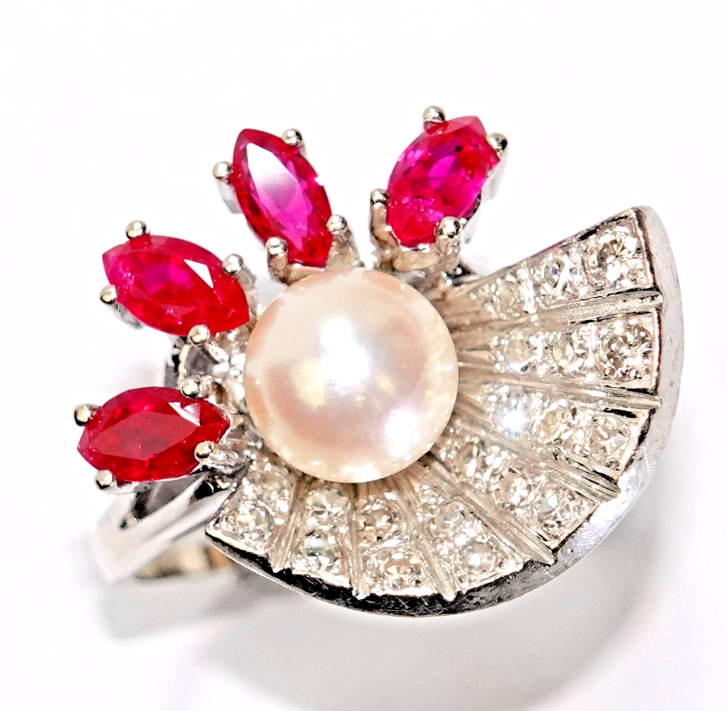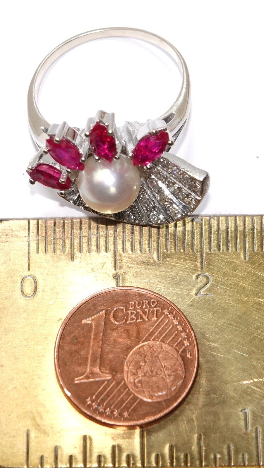 4 Rubine Marquise-Schliff 0,80 ct. - 21 Diam. 0,375 ct. - 1 Perle 7,1 mm Durchmesser