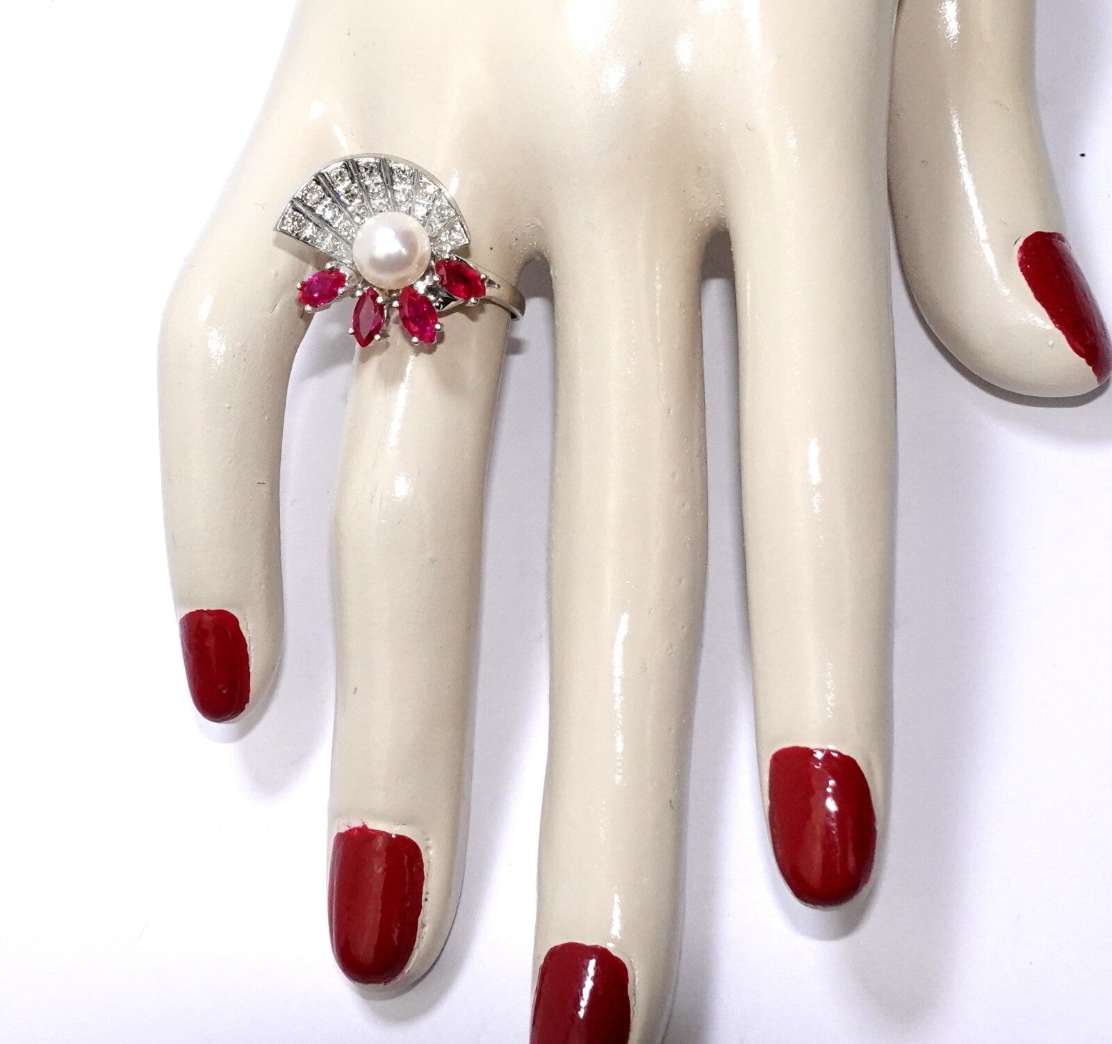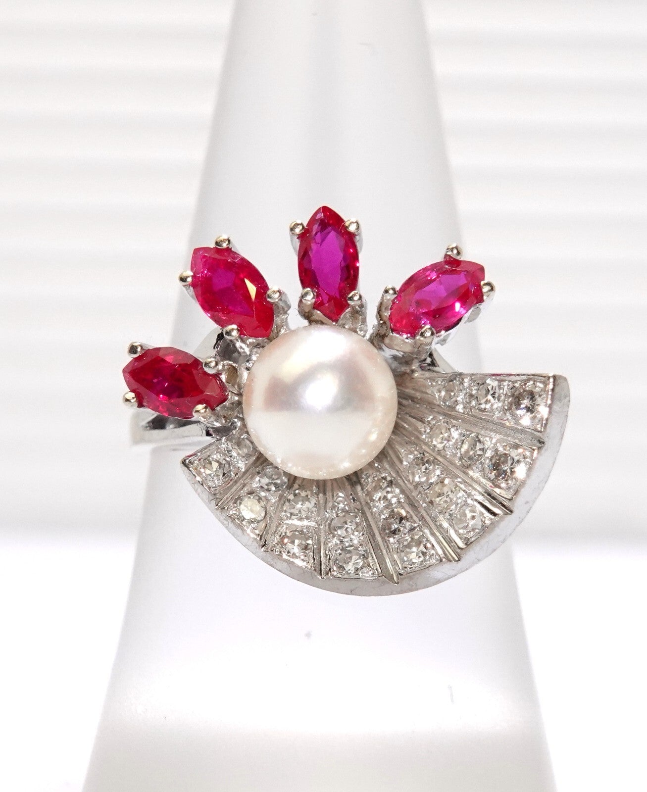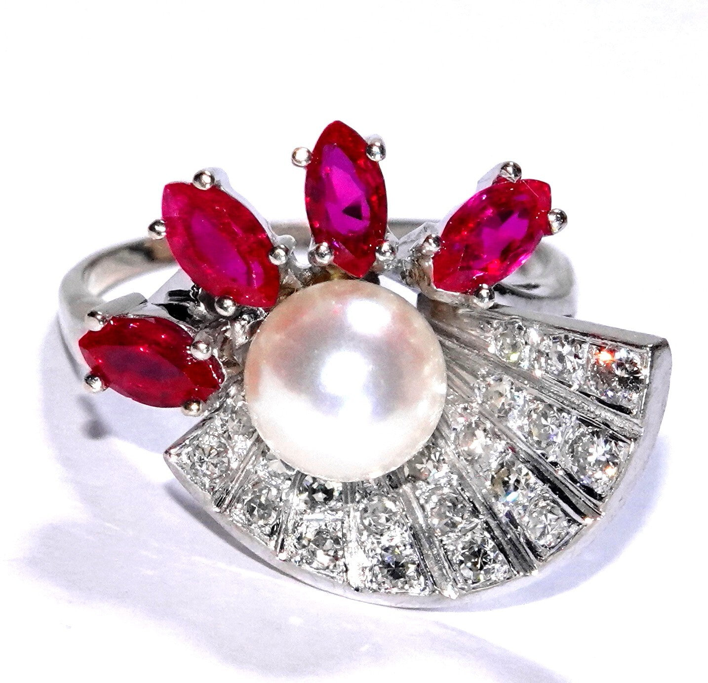 4 Rubine Marquise-Schliff 0,80 ct. - 21 Diam. 0,375 ct. - 1 Perle 7,1 mm Durchmesser