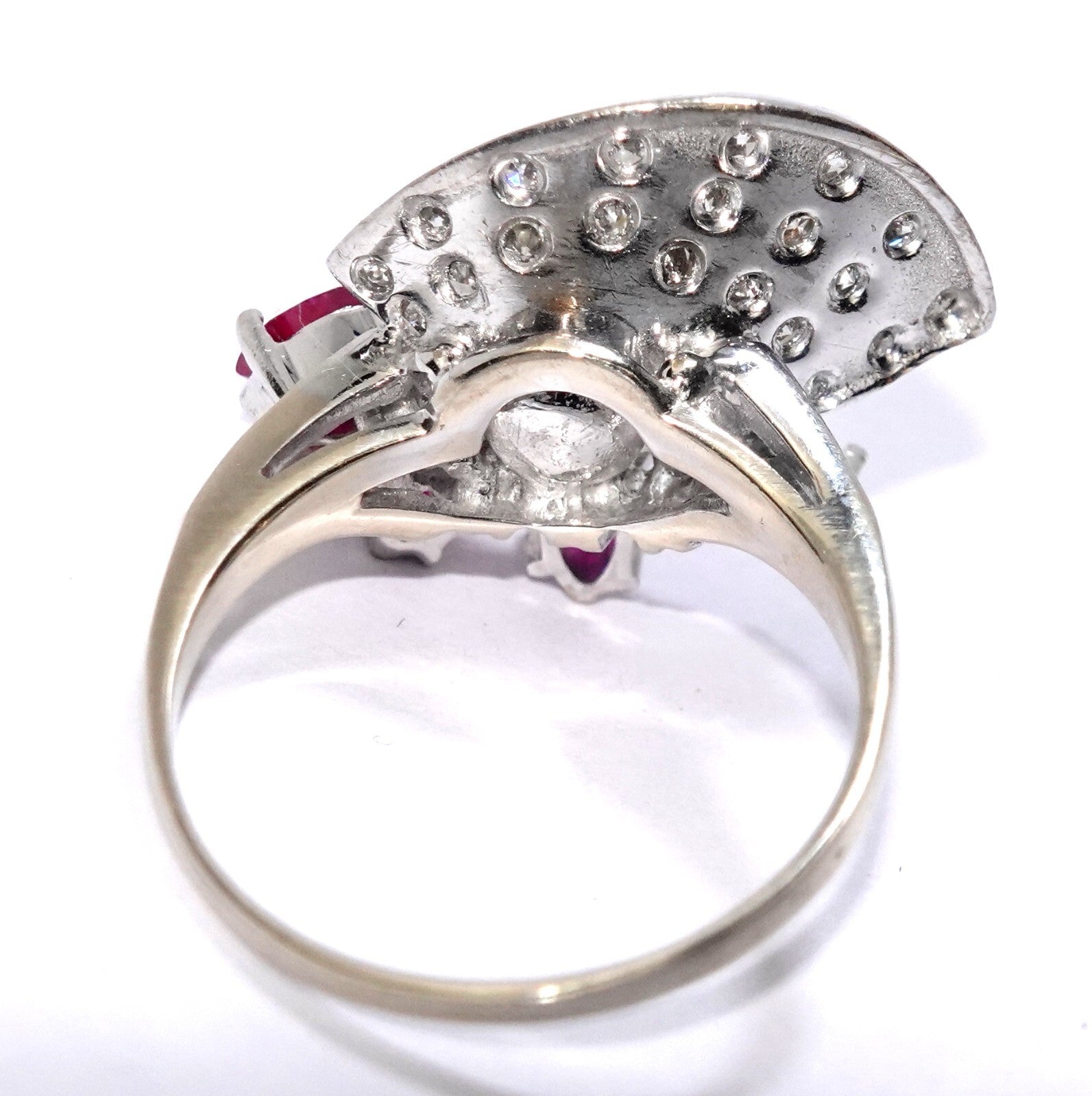 Vintage Fächerring in 585/14K Weißgold. Im Ringkopf gruppieren sich 4 Rubine