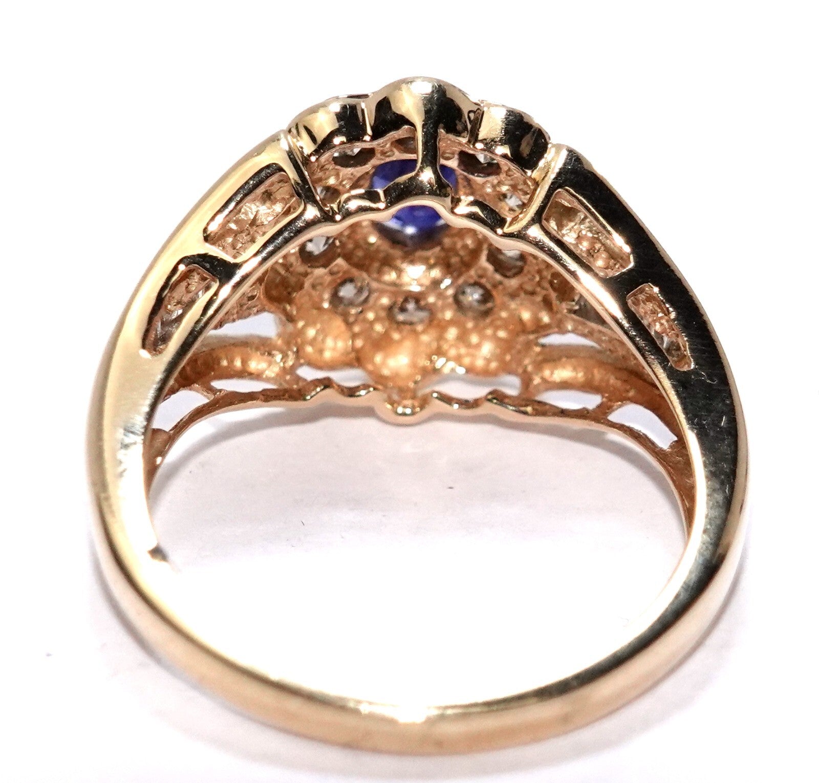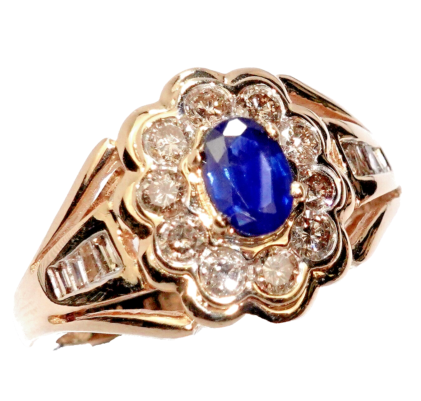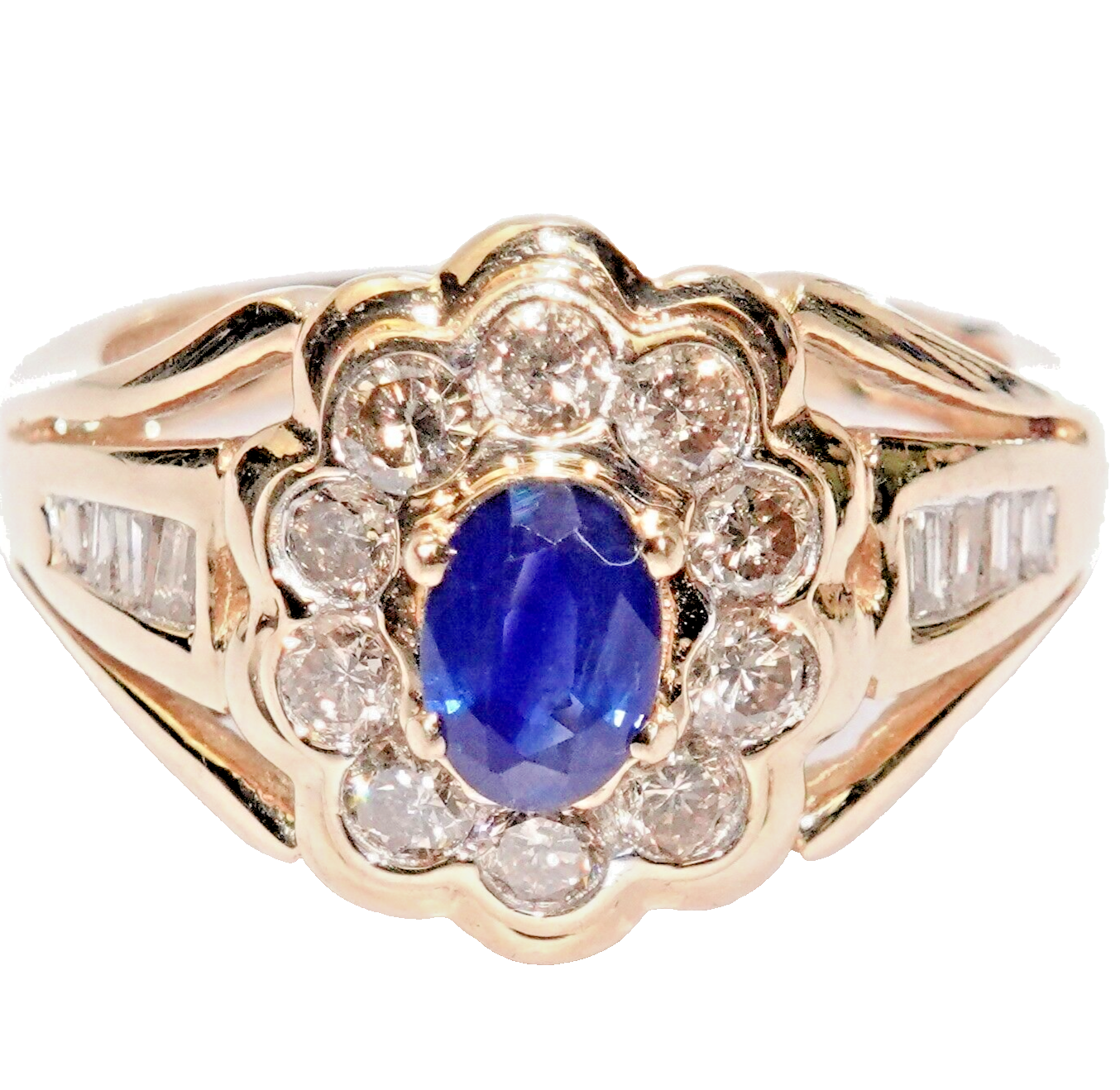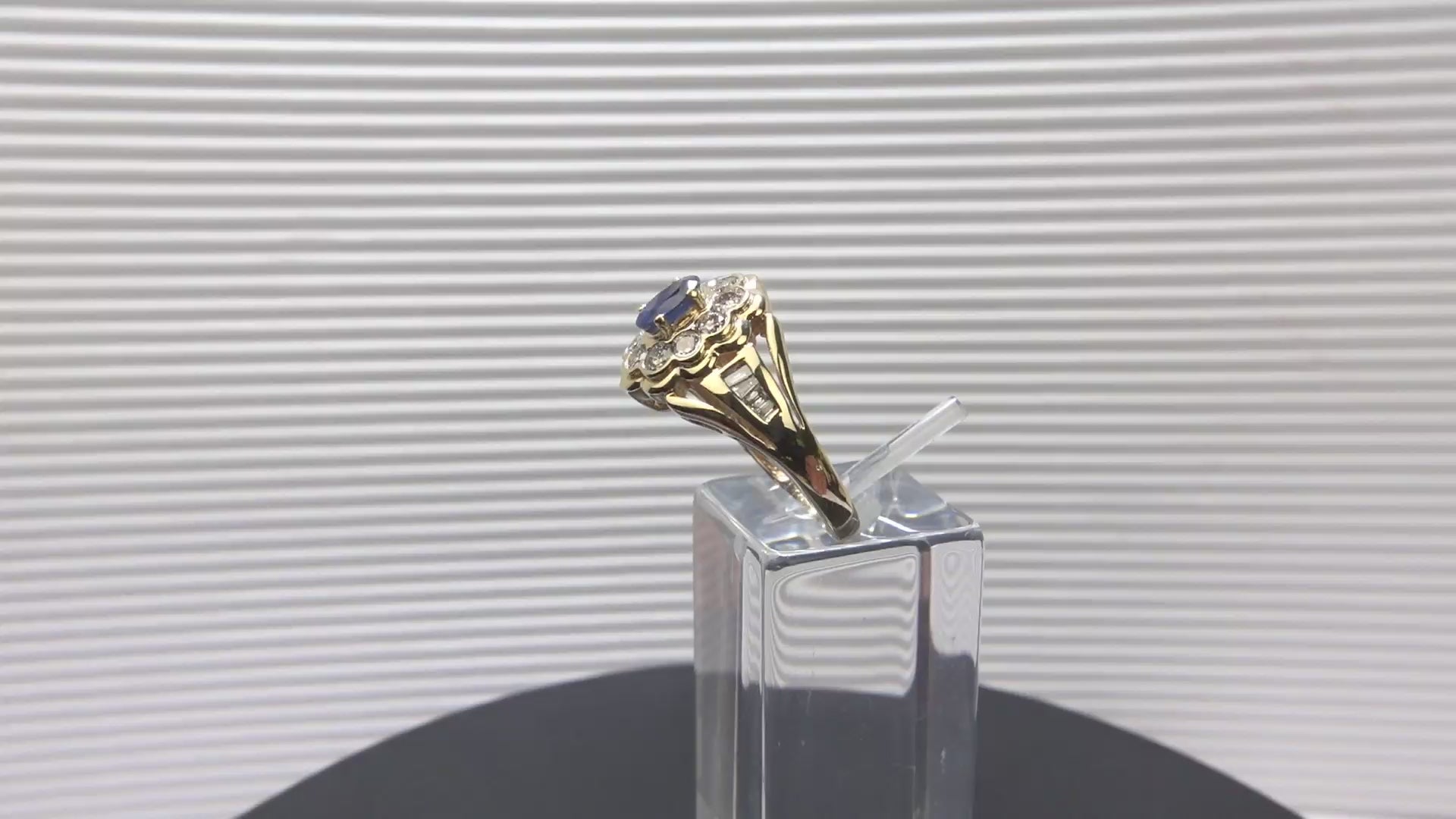 Der kuppelförmige Ringkopf ist mit einem 0,50 ct. Saphir besetzt, der von einem Kranz aus 10 Diamanten umringt wird.