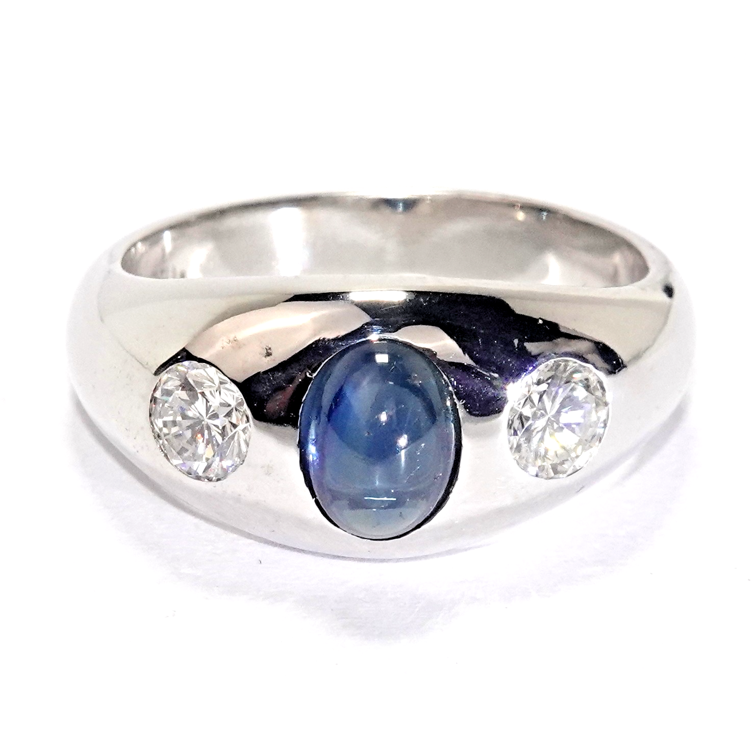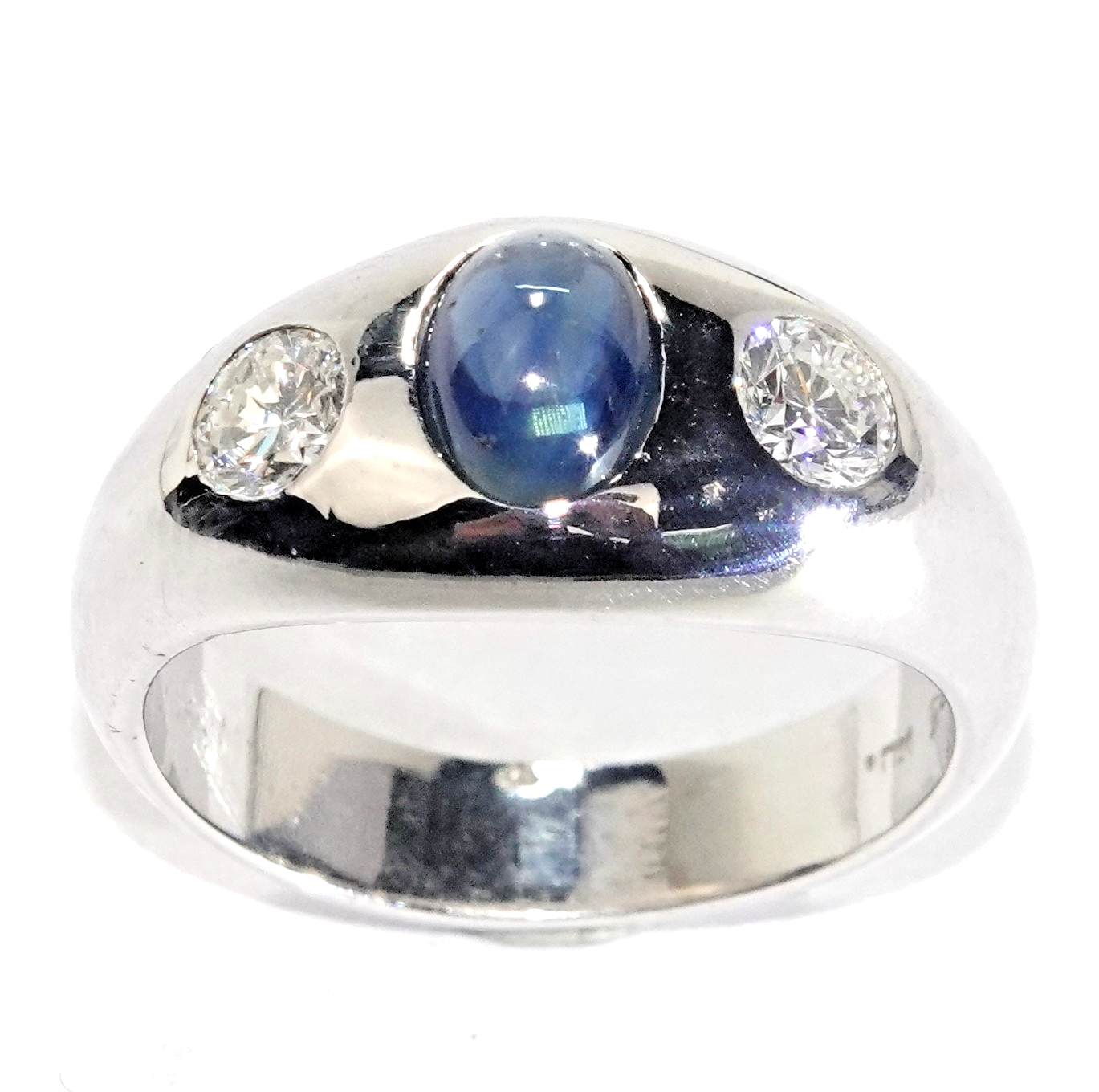 In eingeriebenen Fassungen sind der ovale 1,20 ct. Saphir-Cabochon (Hauptstein)