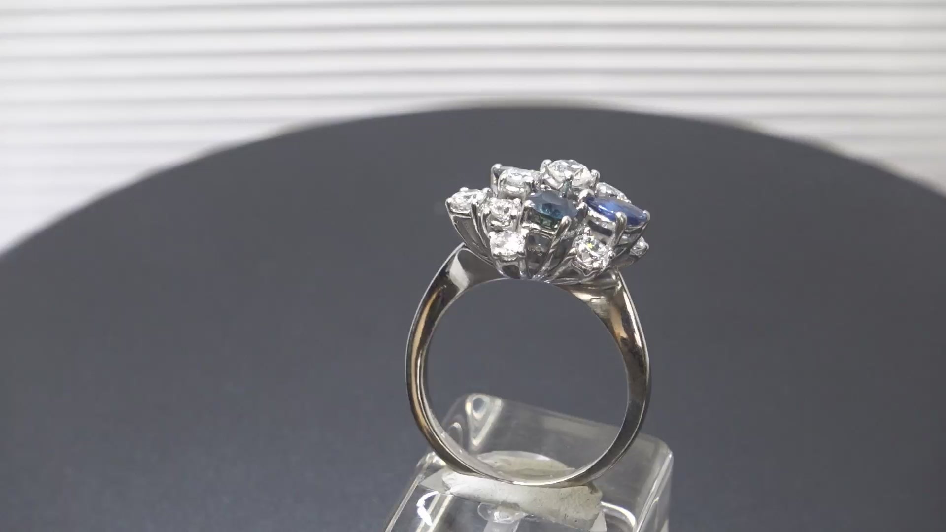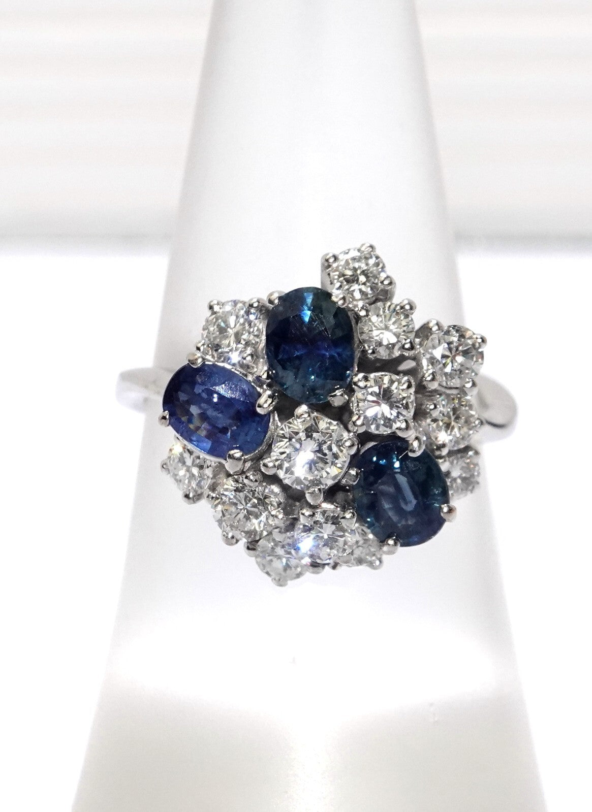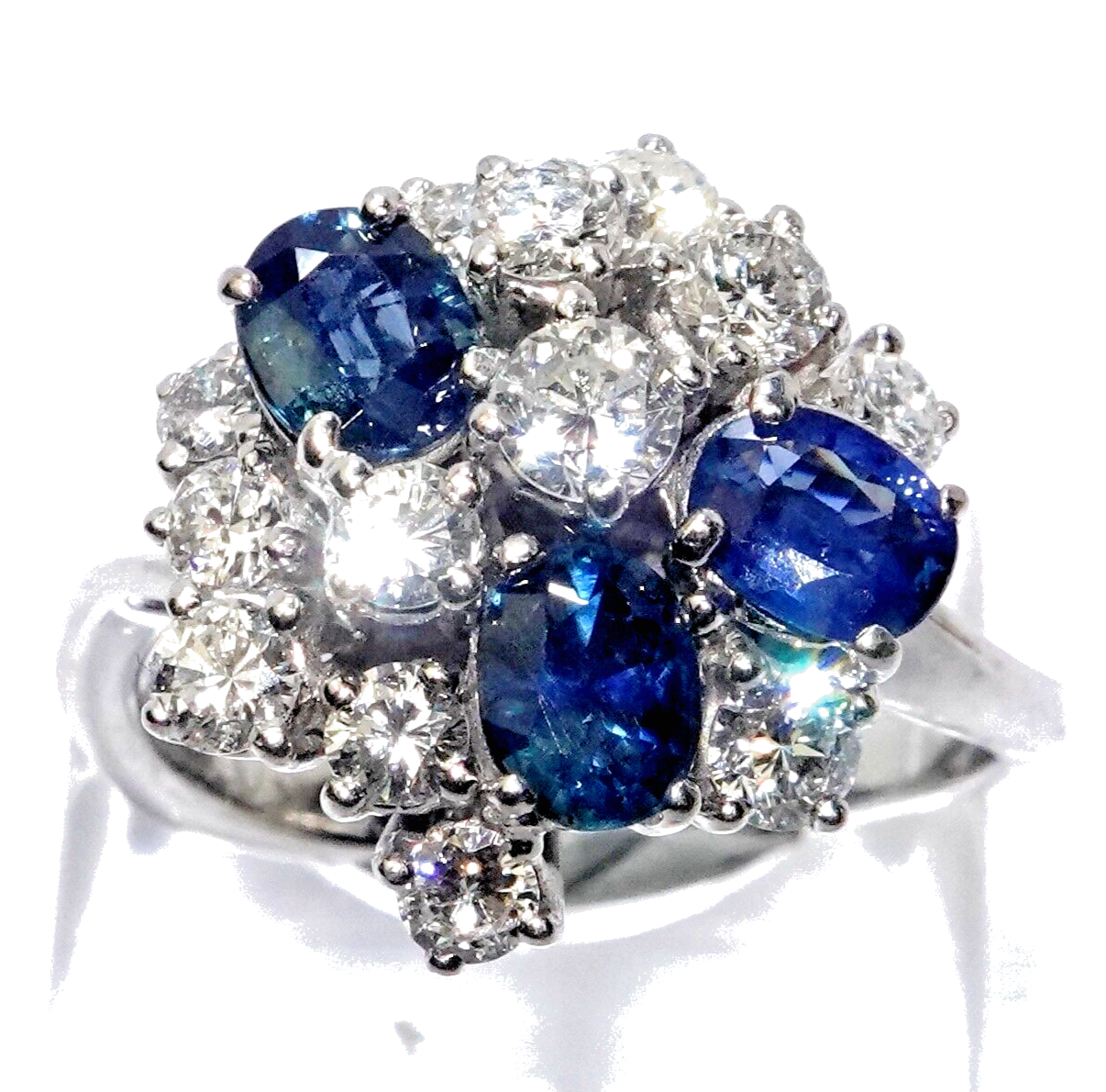 Der Ringkopf wird von einem Cluster aus 3 ovalen Saphiren und 13 Diamanten gebildet.