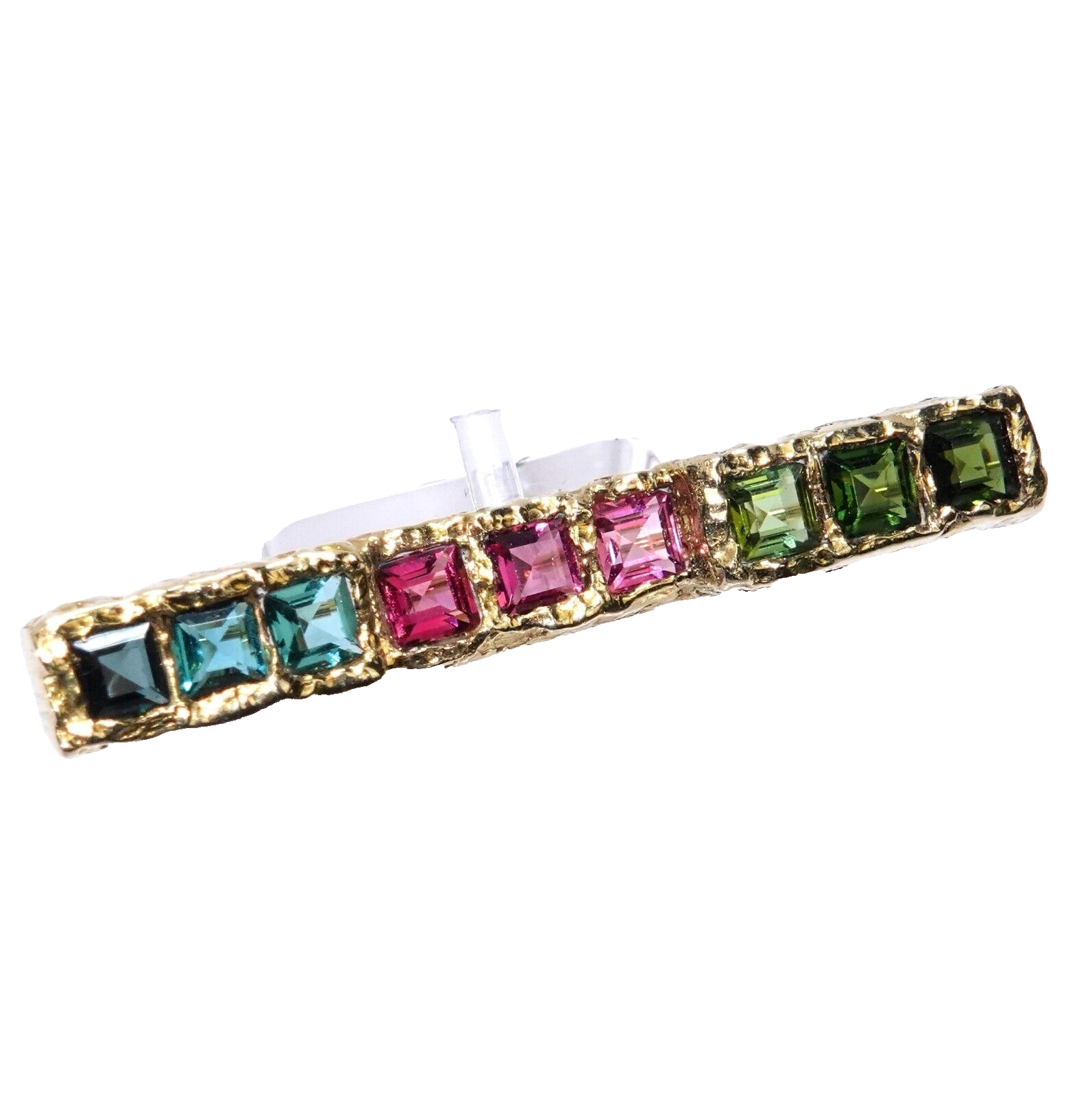 Die 9 Turmaline im quadratischen Kissenschliff sind in 3 Farbgruppen à 3 Steinen in Reihe angeordnet -