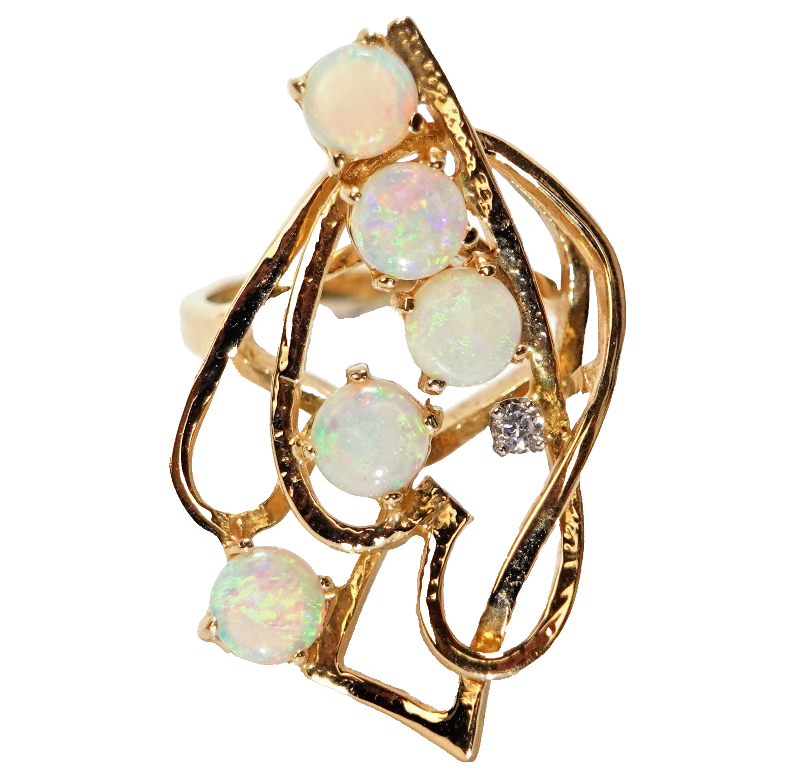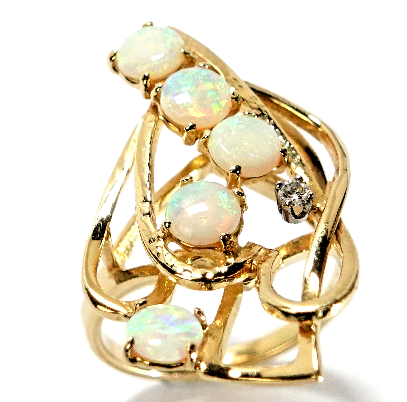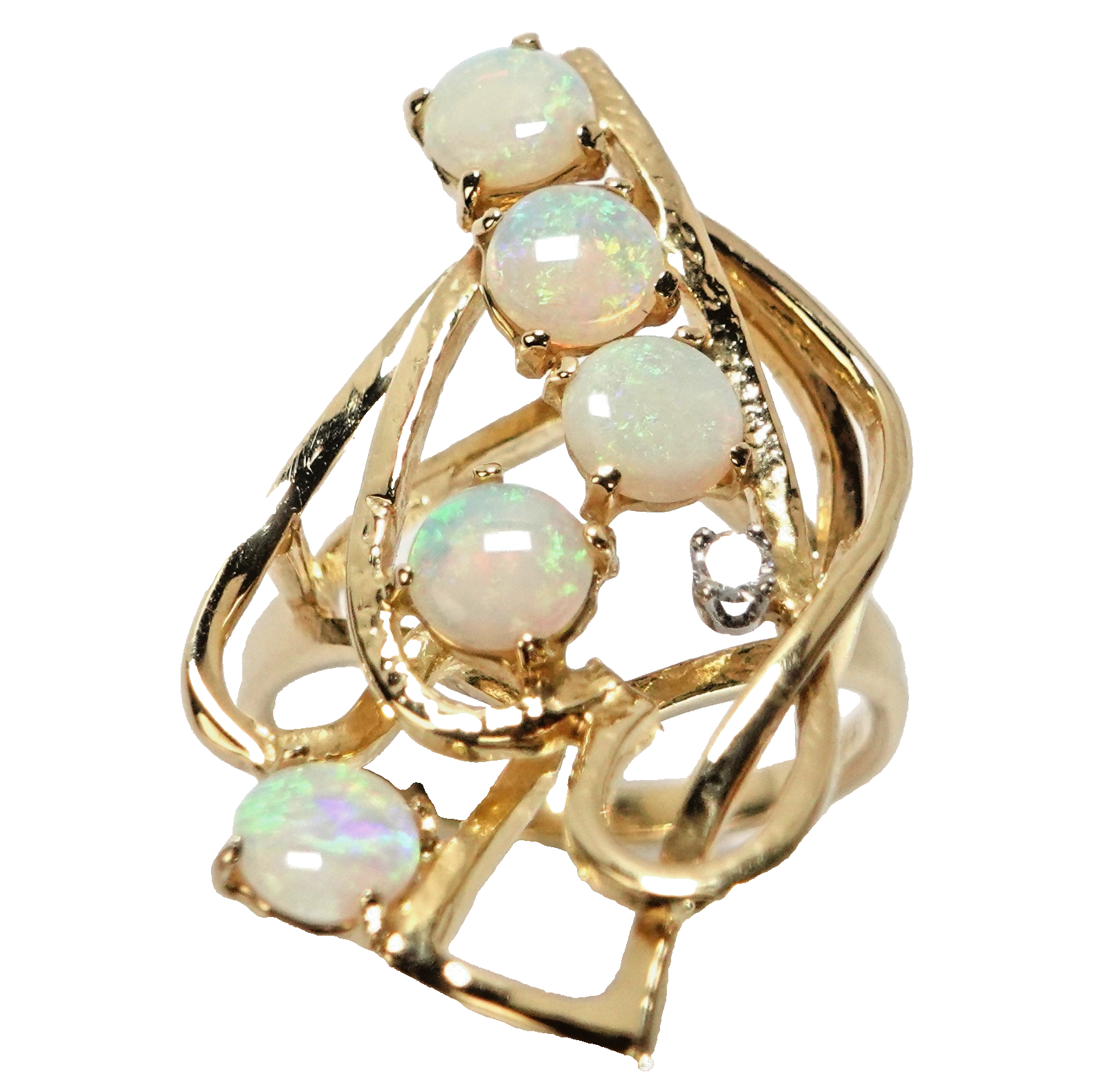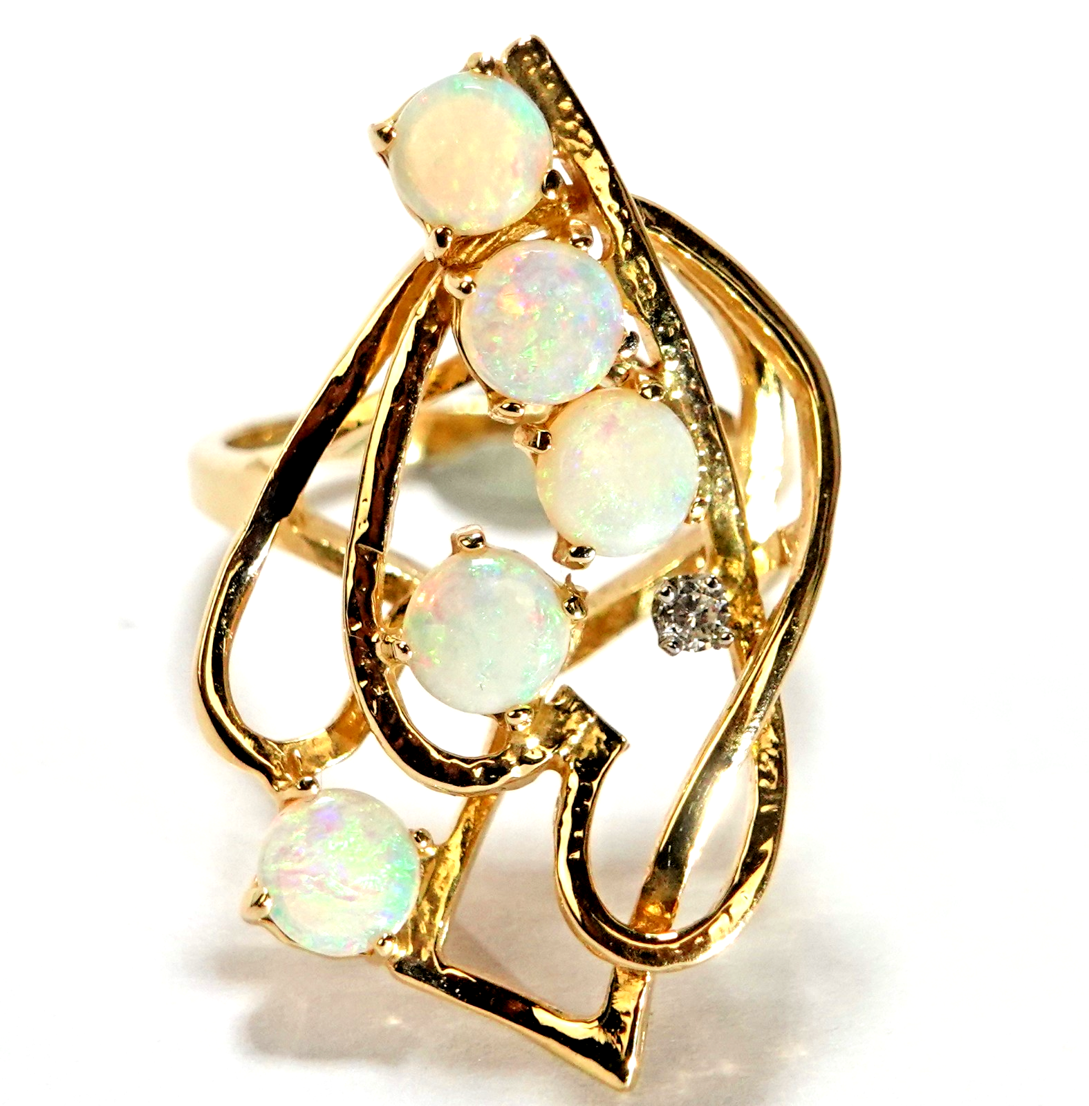 aus Golddraht geflochtener, asymmetrischer Ringkopf mit 5 runden Crystal-Opalen besetzt