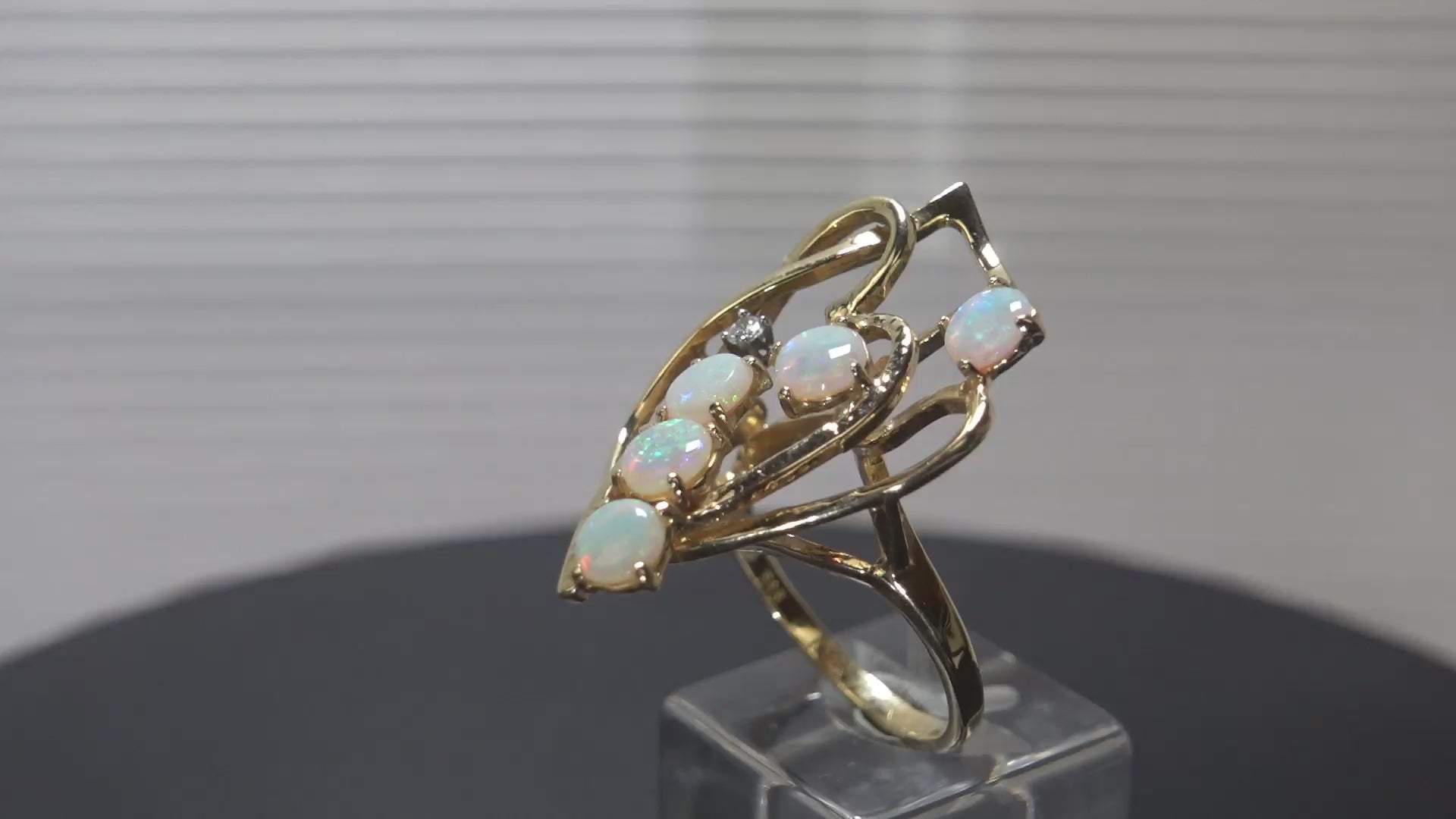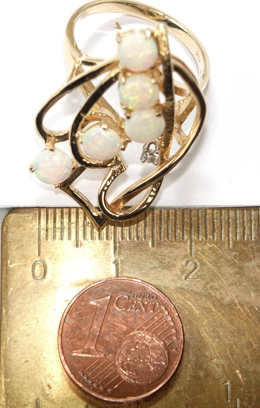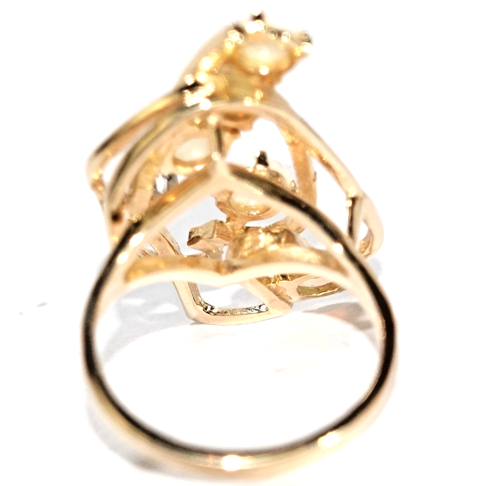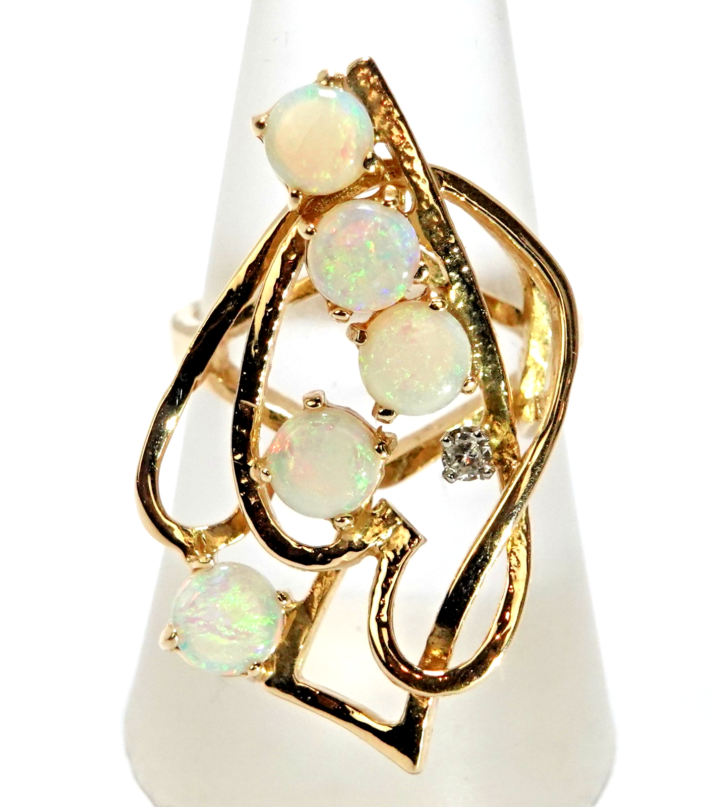 aus Golddraht geflochtener, asymmetrischer Ringkopf mit 5 runden Crystal-Opalen besetzt
